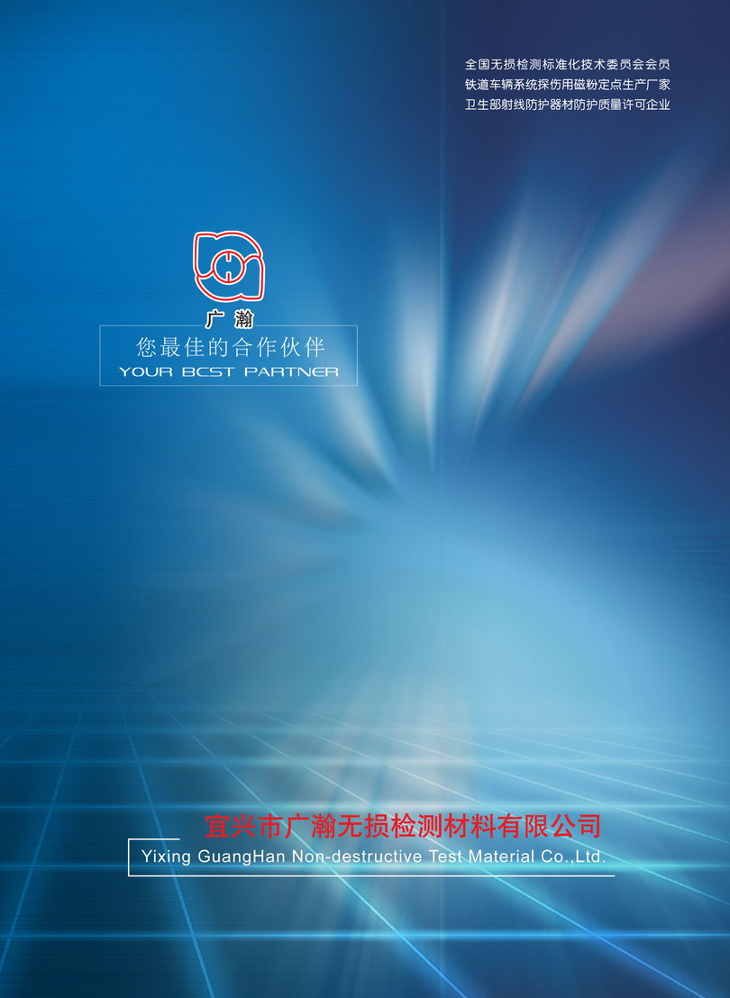 宜兴市广瀚无损检测材料有限公司是研制、开发、生产无损检测材料的专业公司,同时制造各种规格的射线防护设备,承揽射线防护工程的设计及安装,环境保护机械的制造,是国内生产无损检测材料、射线防护设备、环保设备较早的企业,公司是全国无损检测标准化技术委员会会员单位、原铁道车辆系统探伤用磁粉定点生产厂家、卫生部射线防护器材防护质量监测中心质量许可企业、中国石油天然气集团公司物资供应商准入单位、中国石油工程建设协会无损检测专业委员会会员、中国锻压协会会员单位,中国铁道科学研究院金属及化学研究所铁路用无损检测材料检验合格单位,银行资信等级AAA级,无锡市AAA级“重合同守信用企业”,公司注册资本人民币3568万元。目前主要产品有:射线探伤材料系列、磁粉探伤材料系列、射线防护设备系列、着色渗透探伤材料系列及环境保护机械系列。公司规模在不断扩大,资质也较齐全,并拥有技术精良、经验丰富、对工作认真负责的管理人员、生产员工及防护工程施工队伍。公司已在同行业中率先通过ISO9001:2008质量体系认证。公司在国家重点工程“西气东输一线、二线、三线管道无损检测工程”“川气东送管道无损检测工程”“陕京一线、二线、三线、四线管道无损检测工程”中为各管道公司无损检测公司定制了管道探伤专用特种增感屏、暗袋、定位标记尺等材料。在“涩宁兰输气管道无损检测工程”、“兰成渝输油管道无损检测工程”及国外“苏丹管道、利比亚管道、哈萨克斯坦中亚管道、孟加拉国管道、伊拉克管道、中缅管道、中俄管道等无损检测工程”中配套生产了许多管道无损检测专用材料,均得到使用单位的好评及认可。公司生产的YC-2型、YC-5型荧光磁粉、GH-20型复合荧光磁粉、(干法)湿法磁粉、分散剂、消泡剂、防锈剂、防腐剂、GH-50型荧光磁粉浓缩液、磁粉探伤载液、罐装磁悬液、反差增强剂、GPT-II型着色渗透探伤剂等材料,已广泛使用在铁路、航空、机械、石油、石化等行业的无损检测中,是广铁集团、成都铁路局、南昌铁路局、兰州铁路局、昆明铁路局、呼和浩特铁路局、青藏铁路公司、郑州铁路局、南宁铁路局等路局的探伤材料供应商及中国中车所属车辆公司的探伤材料供应商,并为全国各地用户制造各种规格的射线防护设备、承揽了许多射线防护工程及环境保护机械的设备。已为中国航发成都发动机有限公司、中国航发南方工业有限公司、西安航天六院、中车齐齐哈尔车辆有限公司、中车长春轨道客车股份有限公司、中车大连机车车辆有限公司、中车唐山轨道客车有限责任公司、中车青岛四方机车车辆股份有限公司、中车南京浦镇车辆有限公司、青岛四方庞巴迪铁路运输设备有限公司、天津电力机车有限公司、博世热力技术(武汉)有限公司等单位定制了射线防护铅房、防辐射屏蔽门及射线探伤室防辐射设施,已在和谐号动车组制造项目中使用。欢迎来公司光临指导。