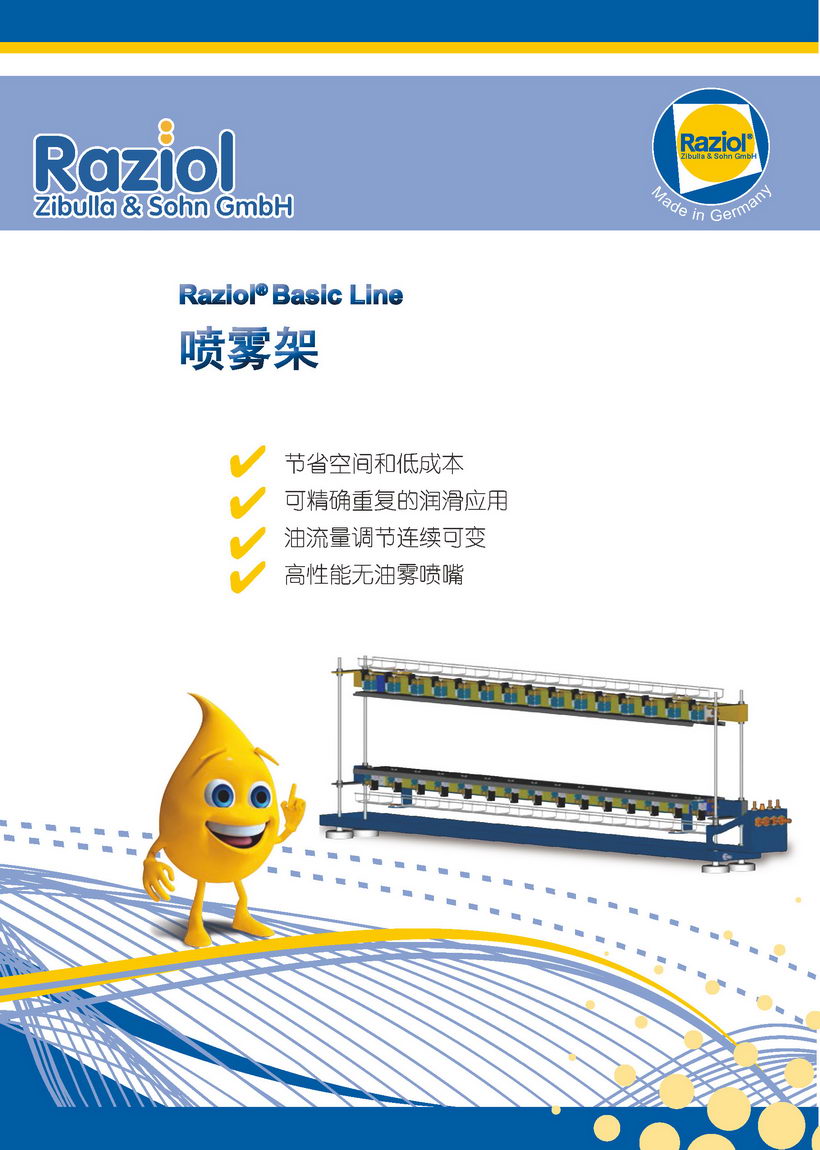 1、Raziol接触式润滑应用(辊轴润滑器)、非接触式润滑应用(喷嘴、喷式润滑器)、喷涂润滑系统(标准喷雾室、喷雾架、摩擦磨损实验装置)、精确定量润滑装置(手动控制、自动控制)、微型定量供油系统;