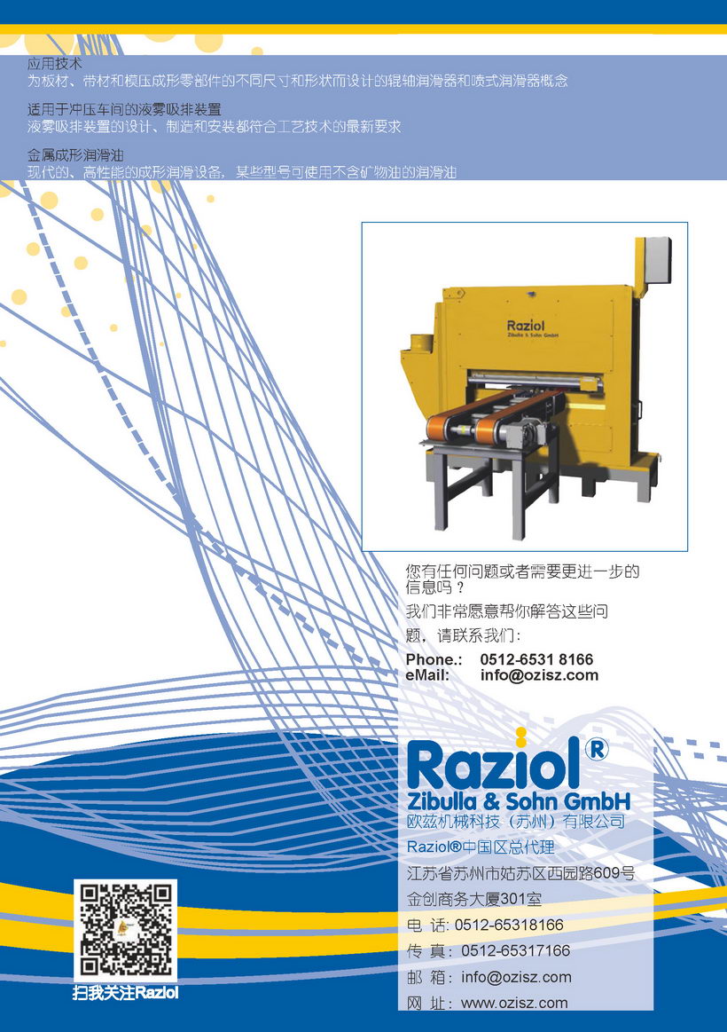 "欧兹机械科技(苏州)有限公司"是目前是德国Raziol润滑系统在中国的总代理,在金属成形润滑领域行业内属于尖端产品,所销售的产品遍布化工,电力,水力,工业自动化,模具制造,汽车制造及各个工业领域,是提供各类制造企业,贸易商,使用人生产制造润滑系统解决方案的综合型销售供应服务商。