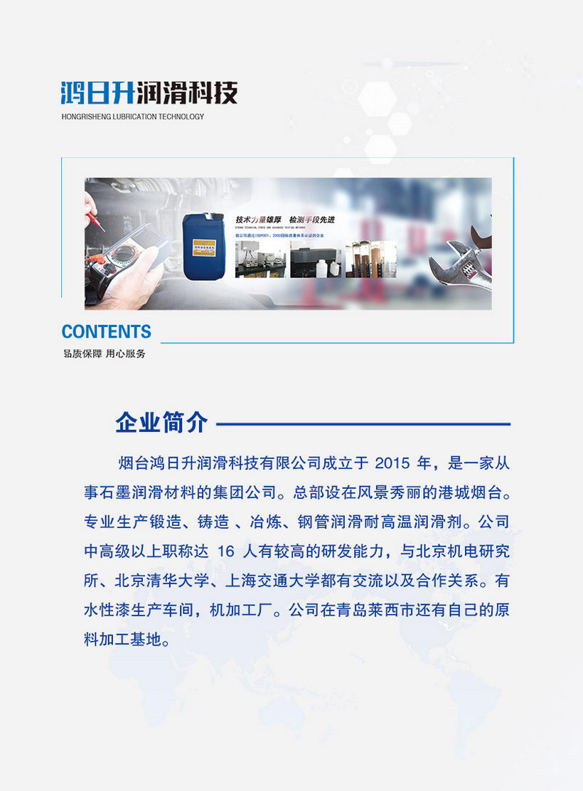 烟台鸿日升润滑科技有限公司位于美丽的胶东半岛-- 烟台,这里物产富饶,人杰地灵,是国内早期生产加工各种规格天然鳞片石墨粉、超微细石墨粉、微粉石墨及锻造石墨乳,钨、钼、钛、钢缆等拉丝石墨乳,玻璃瓶制品、铸造专用脱模石墨涂料等各种石墨润滑剂,各种规格石墨炭素制品,模锻石墨乳成套喷涂设备的大型专业厂家。通过ISO9001:2000国际质量体系认证企业。我国锻压协会会员单位,我国照明电器协会会员单位。被评为我国产品质量信誉双保障示范单位,化工部全国化工产品监督检测质量达标骨干企业。