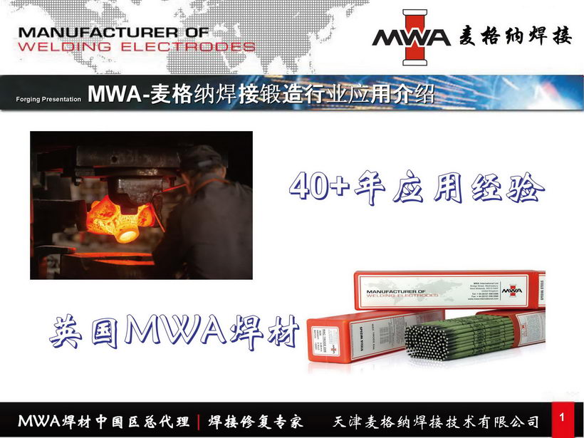 从1974年开始,MWA公司一直就在英国生产高品质的焊条。MWA是目前英国唯一一家维修与维护用焊材制造商,同时设计制造品类广泛的独特镍基和钴基焊材。MWA能够设计生产所有类型的焊条及各种类型焊丝,可以满足各种应用。重新开发的镍合金系列焊材,广泛用于核、化工和石化行业中的Inconels、Monels、Hastelloys、以及Nimonics等合金的焊接。值得一提的是MWA在锻造行业有着几十年丰富的成功应用经验,MWA设计开发的独特钴基焊材已被证明能大大提高工模具的使用寿命。MWA的焊材都经过了严格测试,以确保满足其技术要求,所有批次都经过了高可焊性标准的检查。