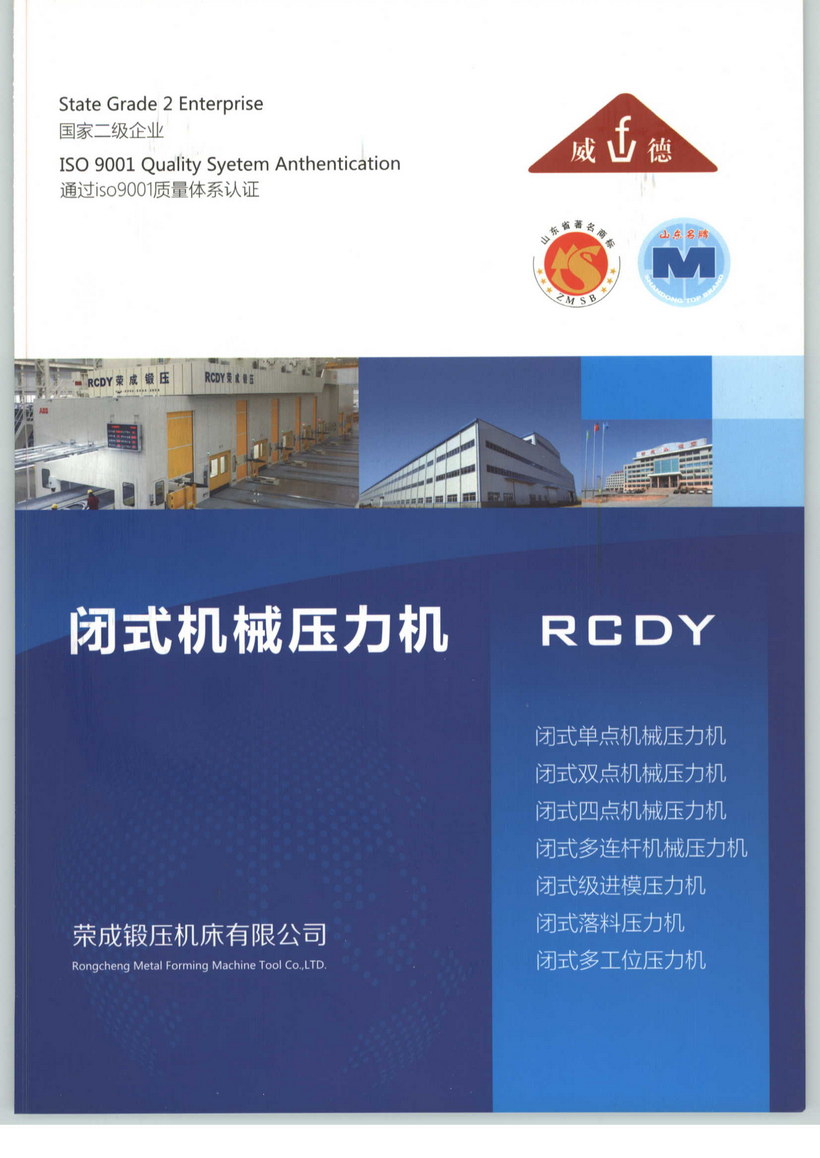 荣成锻压机床有限公司始建于1958年,是生产锻压设备的专业工厂,国家二级企业。工厂占地27万平方米,其中厂房等建筑面积12.8万平方米;共有员工1000余人,其中工程技术人员与质量专业人员132人;拥有主要设备400余台(套),其中精、大、稀设备60余台(套)。公司于2000年即通过了质量、职业健康安全和环境三大管理体系认证。连续27年被评为山东省“守合同、重信用”企业。公司先后被省市相关部门授予省级先进企业、山东省认定企业技术中心、山东省高新技术企业、山东省塑性成型加工机械工程技术研究中心、AAA标准化良好行为企业、省计量保证确认合格企业、威海市锻压机械工程技术研究中心、纳税先进企业、五星级职工之家等荣誉称号,“威德”商标是山东省著名商标,“威德”牌压力机是山东省名牌产品。公司现可生产开式全系列,闭式包括单点、双点、四点、多连杆、多工位、级进模等8大系列300多个品种的锻压设备,技术水平都达到了当今国内先进或领先水平,产品在国内外市场享有盛誉。公司现为国内主要锻压设备制造企业之一。