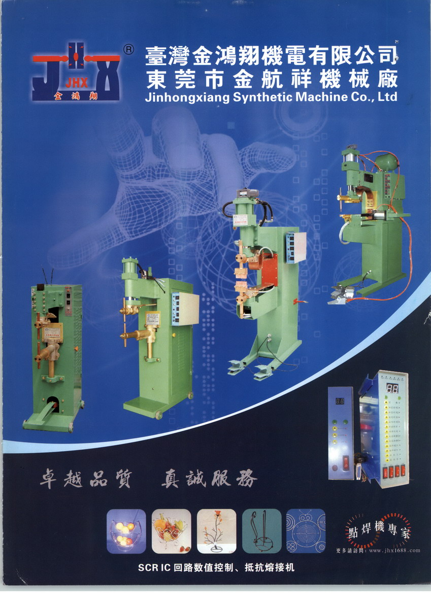 东莞市金航祥机械厂专业生产焊接及五金工艺成形设备。十多年以年,我们总结台湾、日本技术,结合实际众多工厂现场回溃、以及自身众多经验,开发研究生产一条龙。自产,自销,同时诚征代理商的合作。长期以来,我们本着互惠互利的原则,高品质,优价格,深受海内外、全国各地客户的好评和青?V饕?髌酚校鹤闾な降愫富??闾な蕉院富??闾な皆型焊机,空压式点焊机,空压式排焊机,龙门式点焊机,空压式对焊机,空压式碰焊机,储能式点焊机,液压式自动打圈机,机械式自动打圈机,修边机,调直切断机,打扣机,织链机等设备。主要用于五金工艺,五金灯饰,五金家私,五金机械,五金器械,五金船造,五金电子,五金塑胶等各行各业。产品性能:焊接牢固,电流稳定,火花小,调节方便,结构合理。欢迎新老客户来电来涵洽谈业务,携手共谋佳业,共创辉煌。卓越品质,真诚服务!!!