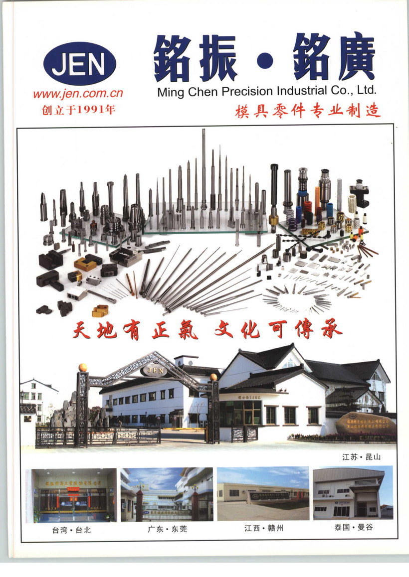 铭振企业是一家集研发、生产、销售、服务于一体的综合性模具配件公司,企业拥有二十几年模具配件生产及管理经验,有一支经验丰富、技术精湛、凝聚力强的近千人队伍。主营各类塑胶模、冲压模标准和非标零配件。铭振企业于1991年从台湾创立发展至今在广东东莞、江苏昆山、江西赣州、泰国曼谷设有公司。企业从日本、美国、台湾等地引进加工设备,现有SEIBU、SODICK、FANUC精密慢走丝线切割机,CNC高速加工中心,CNC精密车床,CNC精密车铣复合加工机,数控深孔加工机,EDM精密放电加工机,无心研磨、顶心内外研磨、精密平面成型研磨、自动平面研磨、内孔研磨、冲子研磨、真空热处理、盐浴氮化等精密设备。企业现有日本、瑞士等地精密检测仪器,如Trimos高度仪,三丰工具显微镜,尼康投影仪,真圆度测量仪,表面粗糙仪,洛氏、维氏硬度仪等。企业产品有塑胶模(化妆品类、医疗用品类、消费电子产品类等)、冲压模具、橡塑模具、汽车模具等各类标准零配件及非标准零配件,客制化产品,自动化设备组件,工装夹具等。铭振企业将以更专业的技术与更精密的设备,为客户提供优质产品与服务。