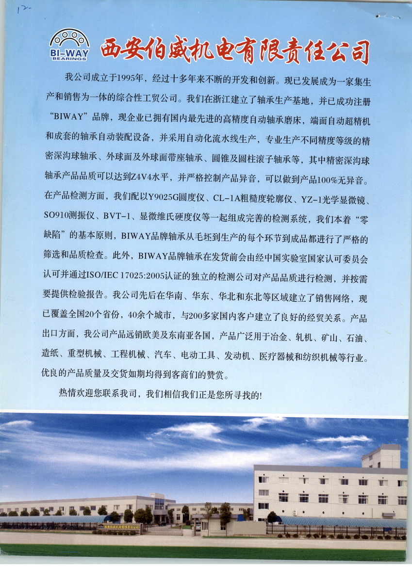 西安伯威机电贸易有限责任公司是一家专营轴承及其相关产品的出口型贸易公司。我司从事轴承出口已有近十个年头了,我们与国内上百家轴承生产企业有着密切的联系,积累了丰富的知识与经验,出口的轴承涉及各种类型及品质,广泛应用于现代化的机械与家电行业。随着国内市场需求的发展,我们现在也准备开发国内市场。 当前国内市场竞争激烈,发展迅猛,机遇与挑战无时不在,我们以“双赢”为目标,慎密决策、长远规划,因为我们始终相信:客户信赖才是我们最具价值的意义所在,客户的利益就是我们的利益所在,在此基础上,我们将会为您及您的企业提供质优价廉的产品和热情周到的服务。