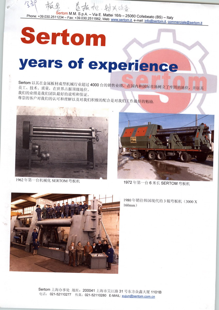 六十年代,SERTOM制造了自己的第一台全液压驱动卷板机,在欧洲首先实现了辊子的液压调平装置,1972年安装于美国俄亥俄容器公司的4000×90mm卷板机是公司早期的代表作品,该设备至今仍然运行良好、每天工作8个小时。