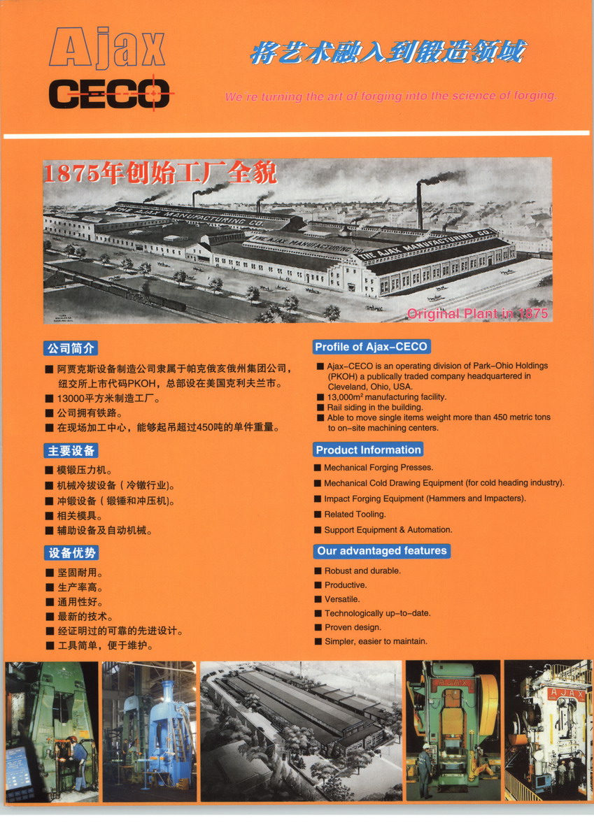 阿贾克斯设备制造公司隶属于帕克俄亥俄州集团公司,纽交所上市代码PKOH,总部设在美国克利夫兰市。13000平方米制造工厂,公司拥有铁路、在现场加工中心,能够起吊超过40吨的单件重量。
