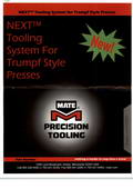 Mate Precision Tooling始建于1962年,总部位于美国明尼苏达州的阿诺卡市,是一家为Amada, Euromac, LVD-Strippit, Murata Wiedemann, PrimaPower and Trumpf机床生产商提供原厂新机包和数控冲床模具备件的领先制造商。全球目前拥有两个制造基地,分别位于美国和德国。在过去的五十年里,MATE已经在产品的品质,价格,交期和服务上占据了行业领导地位。美特的产品和服务的理念只有一样,那就是帮助客户生产出能更有效和优质产品。