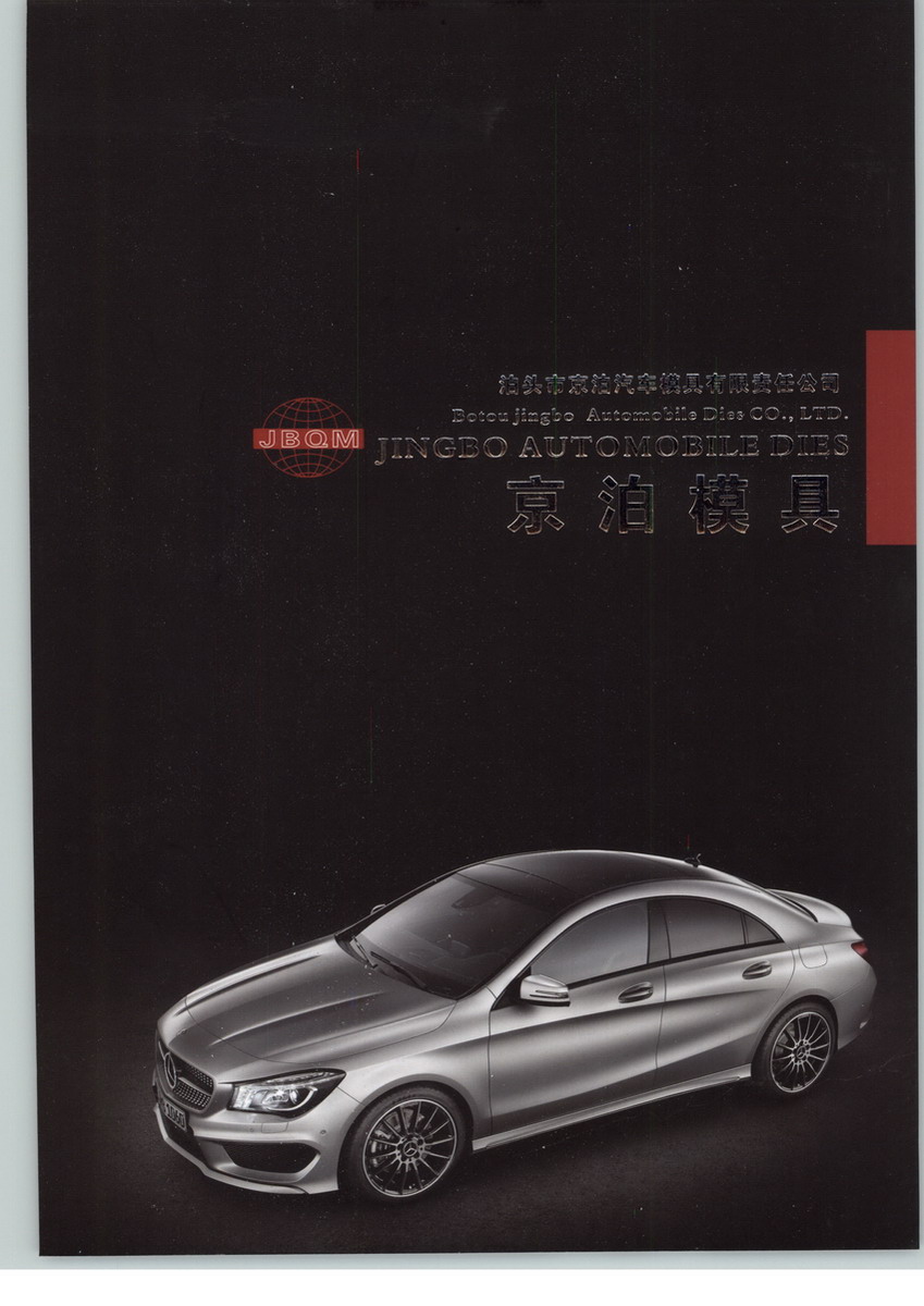 京泊汽车模具有限责任公司下辖天津京泊模具有限公司和泊头市京泊汽车模具有限责任公司两家公司。公司总部位于中国河北省泊头市,是中国著名的“汽车模具之乡”和“铸造之乡”。公司占地75000平方米,西靠京沪铁路、104国阔道,东临京福高速公路,交通非常便利。 京泊汽车模具有限责任公司是一家以设计制造汽车覆盖件冷冲压模具和生产各种牌号模具铸件为主的综合性企业。公司总部泊头市泊汽车模具有限责任公司是从事各类各类汽车冷冲压模具、检具、装焊卡具设计、制造与销售的专业公司,为国内外汽车制造厂家提供车型扫描、车身数据模型开发、车身实物加工制作直至整车工装设计制造的系列服务。分公司天津京泊模具有限公司是以生产覆盖件模具铸铁、铸钢及空冷钢铸件为主的专业化铸造生产厂。 公司现有员工386人,其中高、中级职称的模具工程师40余人,具有丰富的逆向工程、三维实体模具设计加工制造经验。公司运用先进的CAD/CAM/CAE系统和计算机网络信息技术,可快速进行数据交换和远程信息传递,实现资源共享。公司现已装备包括大型高速五轴数控铣在内的大型数控龙门铣床9台,大型三坐标测量机2台,大型冲压调试设备以及美国进口4吨中频感应电炉2台,1吨及0.5吨电炉各一台,拥有12吨/小时及20吨/小时的树脂砂生产线一条,10吨及16吨抛丸清理机各一台.采用由PLC微机控制的40吨/炉的燃油热处理炉进行时效处理,并配备包括德国进口的20通道直读光谱分析仪及数显碳硫仪在内的各种工艺辅助设备200余台套,具有年产700当量套模具和16000吨铸铁、铸钢件的生产能力。公司始终坚持“制造精良产品,创造满意服务”的经营理念,大力倡导“诚信、创新、优质、满意”的企业文化,并以完备的制造设备、科学的内部管理,先进的技术工艺确保一流的质量和最短的制造周期,从而而赢得了国内外众多客户依赖.2.技术水平:公司始终致力于高新技术的开发和应用.具有自车型效果图设计、整车数据模型的开发、逆向工程设计、整车模型加工验证直至全套车身模具、检具、装焊卡具设计制造和整车车身工装协调匹配的能力.先后为华源凯马机械股份有限公司、东安黑豹股份有限公司、保定长城华北汽车有限责任公司、南海福迪汽车公司等车身制造企业完成了整车型的设计开发任务,拥有十多个整车型的开发制造经验,在国内SUV和皮卡车行业拥有近80%的市场占有率。公司拥有一支优秀的车身开发技术队伍和体现当今先进水平的软硬件。在逆向工程、板料冲压工艺模拟分析、模具三维实体设计、模体浇铸技术、时效和热处理技术、远程信息技术等领域具有相当丰富的经验和技术实力。特别是在激光拼焊板冲压技术、冲压工艺模拟技术、铸态空冷钢制造技术等方面达到国内领先水平。