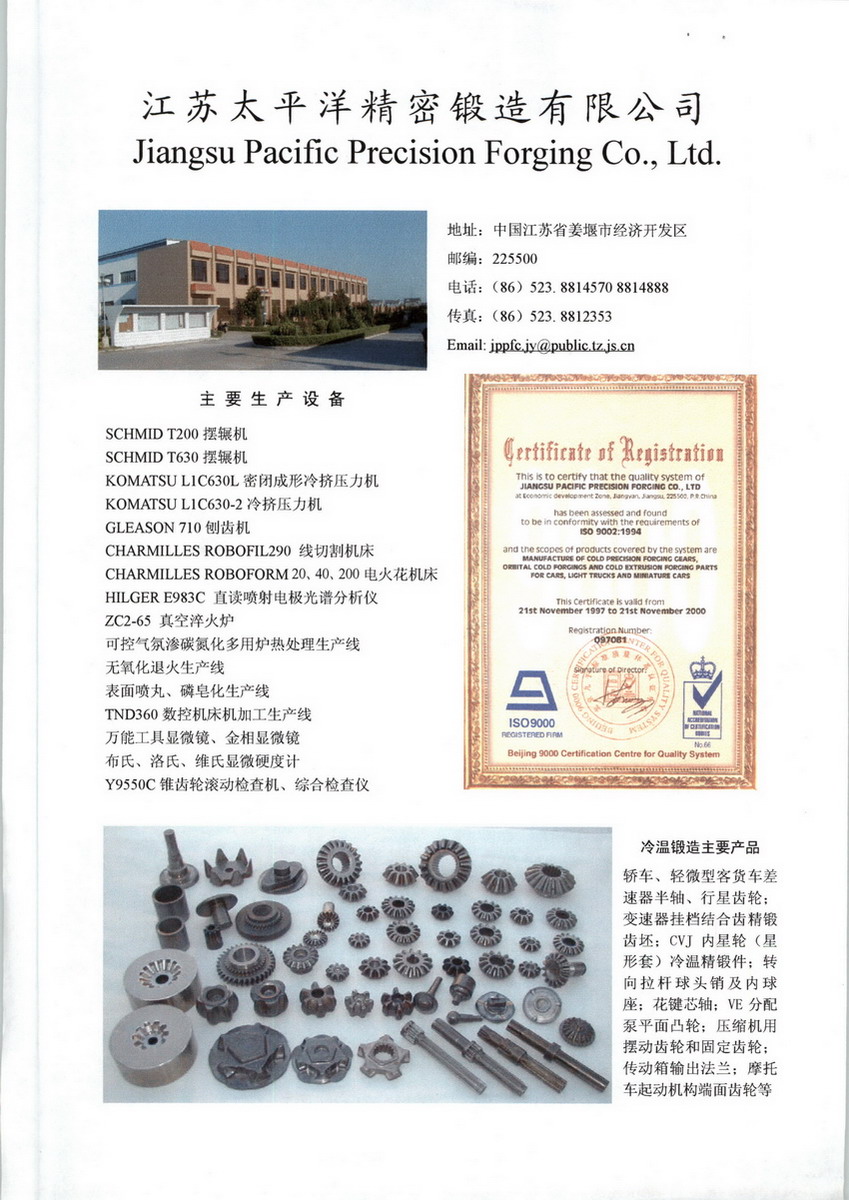 江苏太平洋精锻科技股份有限公司,注册资本40500万元,银行资信AAA级。公司主营业务为汽车精锻齿轮及其它精密锻件的研发、生产与销售,是行业领先的精锻齿轮供应商。