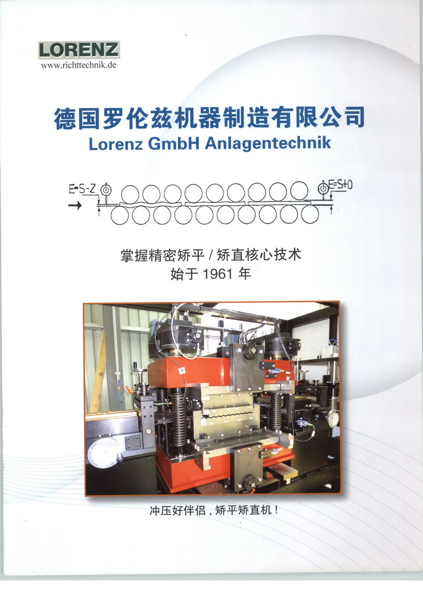 德国罗伦兹机器制造有限公司由H. Lorenz先生创立,专业生产19/21辊精密矫平设备, 9辊矫直装置, 开卷机和收卷机, 电动辊喂料器和横向零件进给装置. 所有设备所需电气,气动和液压控制装置也有我们自己的特点. 是矫平矫直技术的创始人.公司拥有50多年矫平设备生产和研发经验. 从1961年开始,H.Lorenz先生就研发板材矫平技术, 并将此技术先后介绍给两家德国公司, 使这两家公司开始了矫平设备的生产。