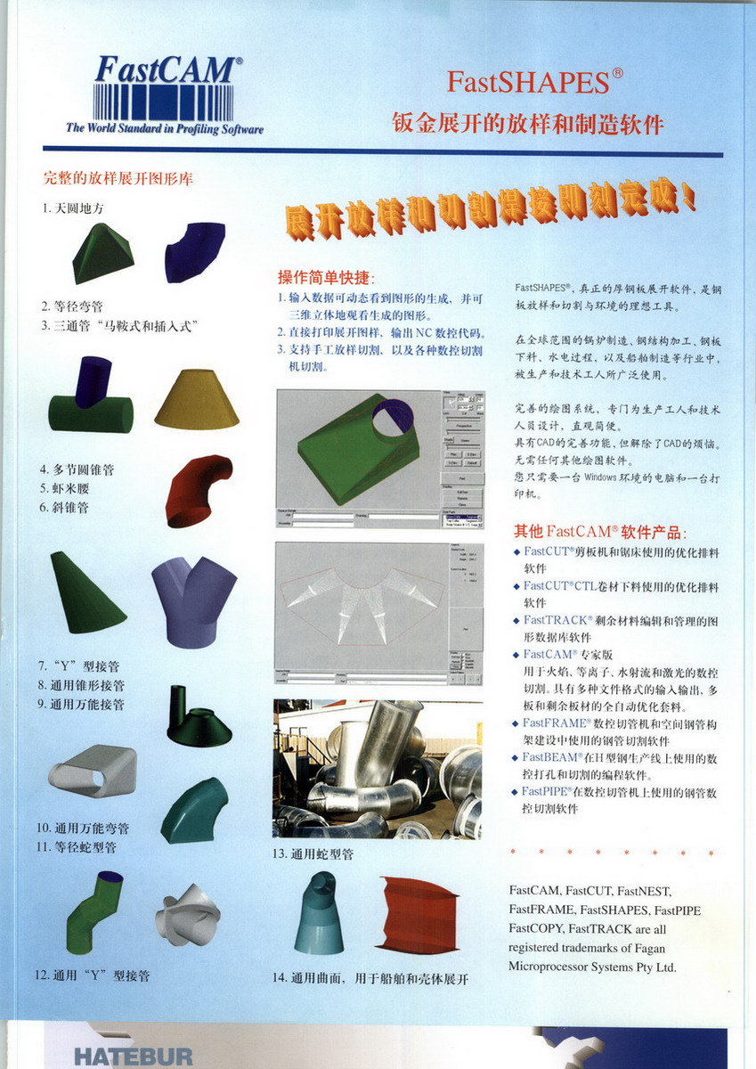 FastCAM是一款全自动共边连割套料软件(当前版本V 5.10)该软件主要针对数控切割机,包括火焰、等离子、激光和水刀等数控切割机,用于任意形状零件的绘图、编程、套料、校验和数控切割。通过FastCAM可以提高钢材套料率,有效节省钢材; 提高编程、套料和切割工作效率,有效提高切割生产效率。FastCAM全自动共边套料功能是在自动套料过程中实现矩形零件和非矩形零件,即任意零件不同边长的自动共边,无需手工编辑,自动处理不同零件的共边和连割,为防止和避免热切割变形,自动处理切割方向和穿孔点的位置,借用切割过的边缘,直接预热切割,避免穿孔。共边套料切割的主要用途:一是避免和减少零件间的切割间距,提高钢材利用率,二是共边切割使每个矩形零件少切一条或二条边,有效减少切割行程,提高切割效率,三是共边切割借用切割过的边缘预热,避免穿孔,减少预热时间,提高切割效率,同时有效节省割嘴和耗材。