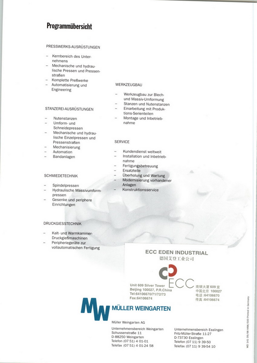 the present day company of müller weingarten ag was formed by the joining of two companies which were both rich in tradition. these two companies now make up the two main german production divisions of esslingen and weingarten.esslingen division the history of the esslingen division began in 1863. christian friedrich müller, after completing his apprenticeship, set up his "fritz müller" engineering workshop on the neckar river in esslingen, a town near stuttgart. initially the new company made hydraulic equipment for the production of oil from rapeseed and other materials. from this original workshop, the company developed over the years to become well known throughout the world for hydraulic presses and press lines. the company was later turned over to christian friedrich müller's son, fritz müller, and then to the grandson, dr. erhard müller.weingarten division heinrich schatz founded his workshop in weingarten in 1866 for the manufacture of sewing machines and machines for embroidery. the success of these products enabled the young company to diversify into the field of sheet metal forming machines and to establish a patent for guillotine shears. the company grew steadily and by the turn of the century, it had 400 employees. not long thereafter the production program included, besides guillotine shears and piercing presses, a line of power presses and friction screw presses, as well as body panel stamping presses and dies for the automotive industry.müller weingarten ag in 1982 the two companies, fritz müller pressenfabrik in esslingen and maschinenfabrik weingarten ag in weingarten, were merged to form müller weingarten ag. an association going back many years thus became the basis for a successful business for building hydraulic and mechanical presses, automation, die casting machines and dies. today most of the industrial countries of the world have müller weingarten equipment and production lines in operation.muller weingarten corporation in 1988 müller weingarten ag opened its first facility in the usa. muller weingarten corporation was formed in order to better serve the company's globally oriented customer base. the company began its business in the detroit, michigan area and is today located 15 miles north of downtown detroit in the city of madison heights.