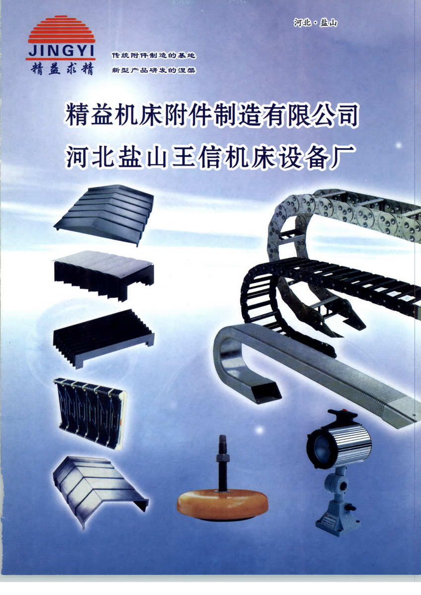 盐山县精益机床附件制造有限公司为机床附件专业生产单位,东临渤海,有便利的205国道,西有畅通的京沪、京九铁路,坐落在美丽的漳卫新河河畔,她始建于1984年,集开发、设计、制造销售于一体。是机床附件、防护装置生产历史较早、专业性强、技术力量雄厚、国内同行业规模较大企业。我公司依靠科技开发产品,企业充满活力,产品广泛用于国内外各种机床和设备的维护上。我们的产品有:柔性风琴式防护罩(皮老虎)、钢板不锈钢导轨护罩、伸缩式丝杠护罩、卷帘防护罩、防护裙帘、防尘折布、钢制拖链、工程塑料拖链、机床工作灯、机床垫铁、JR—2型矩形金属软管、DGT导管防护套、可调塑料冷却管、吸尘管、通风管、防爆管、行程槽板、撞块、排屑机、偏摆仪、平台及各种操作件。