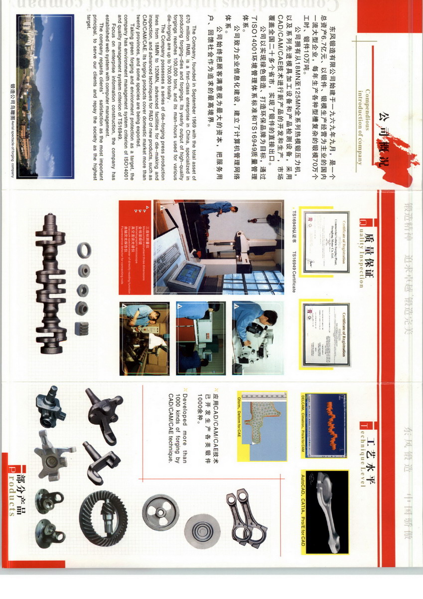 东风锻造有限公司以曲轴、连杆、轮毂、齿轮等为主导产品,生产能力达115000吨/年。公司运用CAD/CAE/CAM等手段,在高、精、大锻件的开发和制造上独具优势。拥有18MN-120MN系列热模锻压力机、4.5MN-16MN系列水平分模平锻机和哈德贝尔快速镦锻机组成的锻造生产线。通过TS16949质量体系认证,配备超声波、磁力探伤、三坐标测量仪等检测手段。以高速数控加工实现高精度模具的快速制造。