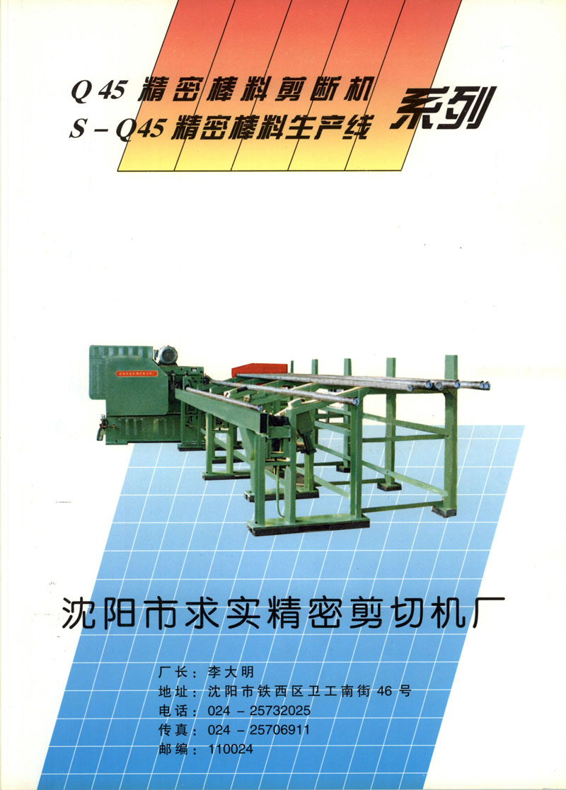 沈阳市求实精密剪切机厂,是专门从事精密棒料剪断机的研制开发和生产的企业。企业技术力量雄厚,集中了国内著名的精密棒料剪断机设计、制造专家。我厂研制的精密棒料生产线,不仅挡住了进口,填补了国内空白,还被中国锻压协会列入1996年8月至2001年9月大事件中。