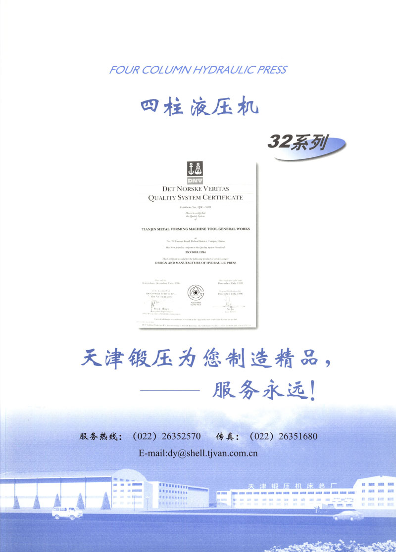 天津市锻压机床总厂是我国起步最早的企业,现有固定资产2.4亿元各类专业技术人员480人,是机械部大型骨干企业。自我厂自行设计国内第一台液压机,开创了我国中小型液压机生产历史以来,目前拥有26个系列,300余品种,产品从80KN至5000KN,以形成年产1200台各类液压机的生产能力,居国内同行业之首。1983年YT32-315四柱液压机获国家银牌,1990年YT32-630/1030双动力拉伸液压机一举荣获同行业唯一的国家金奖另有部优产品3项,市优产品5项。产品广泛适用于汽车制造、粉末冶金、金属冷挤、轻工家电、化工机戒、航空航天、模具磨料、机戒制造等行业,被国家指定为替代进口产品,行销全国,产品出口到日本、荷兰、东南亚等20多个地区和国家、市场占有率居全国同行业第一。