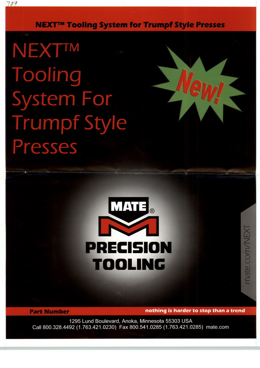 美国MATE模具公司成立于1962年。总部位于美国明尼苏达州,阿诺卡(ANOKA),靠近五大湖区。工厂建筑面积为大约30,000多平方米,共有五百多名员工,年销售额超过80,000,000.00美元。数控冲床模具是我们唯一的业务。另外,我们在德国,英国建有分支工厂,在马来西亚,瑞典,中国设有销售代表处,在全球65个国家有代理商。公司有一大批专业工程师为客户提供高质量的技术服务。