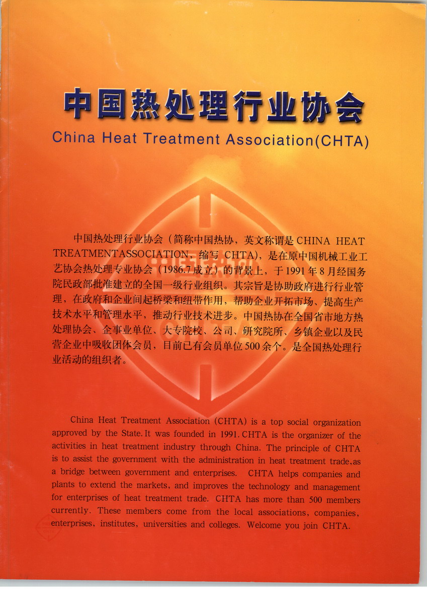 中国热处理行业协会(简称中国热协,英文称谓是CHINA HEAT TREATMENT ASSOCIATION,缩写CHTA),是在原中国机械工业工艺协会热处理专业协会(1986.7成立)的北景上,于1991年8月经国务院民政部批准建立的全国一级行业组织。其宗旨是协助政府进行行业管理,在政府和企业间起桥梁和纽带作用,帮助企业开拓市场、提高生产技术水平和管理水平,推动行业技术进步。中国热协在全国省市地方热处理协会、企事业单位、大专院校、公司、研究院所、乡镇企业以及民营企业中吸收团体会员,目前已有会员单位近1000余个,是全国热处理行业活动的组织者。