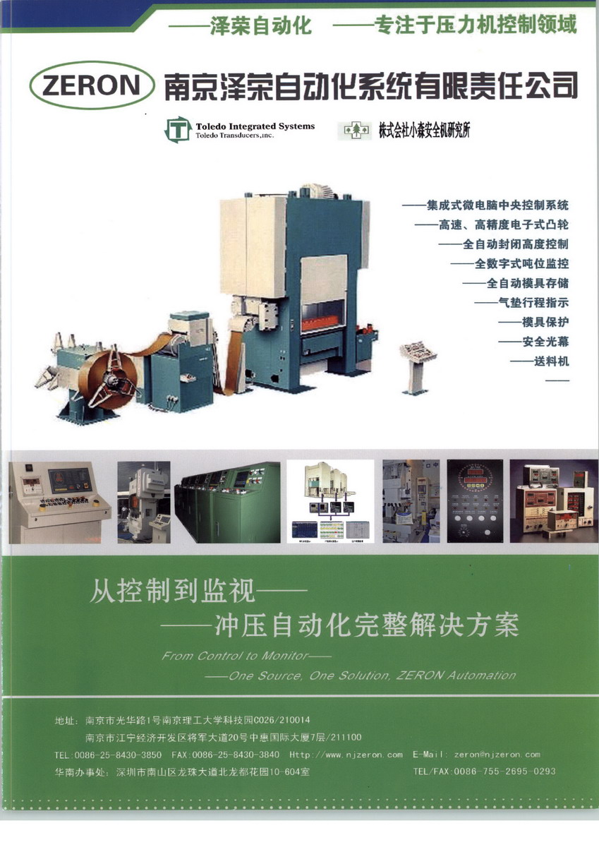 南京泽荣自动化系统有限责任公司(ZERON AUTOMATION)---致力于锻压行业的自动化控制系统制造商,秉承全心专著、精致服务和领先技术业已赢得在中国同行业中的领军行列。进行国际化合作是公司一贯主张,为与此行业的世界强手进行学习公司与美国、日本、台湾、韩国、印度等高科技公司建立了深层次的商业合作,先进的理念和软、硬件技术使公司成为锻压自动化行业的潮流倡导者。专业才能赢得市场---公司以此为经营宗旨,我们从控制到监视为冲压自动化提供完整的方案和成套设备。产品涵括:美国TOLEDO压力机吨位数字式监控系统、中小型及高速压力机控制系统、电子凸轮、转角指示、模高控制、小森安全光幕以及全集成的电气控制柜等整体电气自动化方案。提供有价值的产品和服务让我们与客户取得了持续的合作,在众多的工厂冲压车间里,可很容易的看到有我们提供的产品在工作。