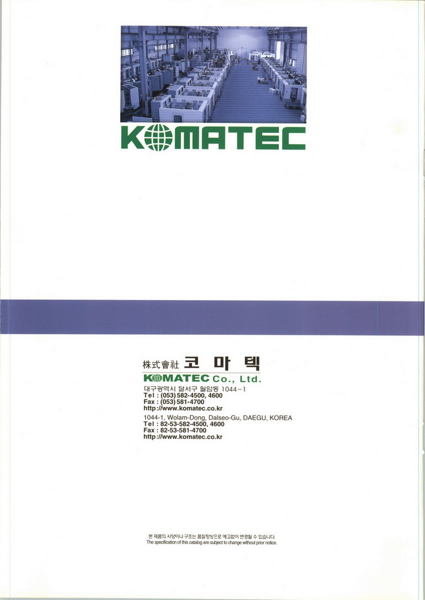 KOMATEC will continue contribute to F•A through production of CNC TAPPING CENTER, and will satisfy the demand of users through progressive machine tools with good productivity. Now, The demand of F•A is showing a steady growth. Therefore, KOMATEC will make effort to develop innovation of production technology and highly efficient machine through a continuous facility investment. According to the above, KOMATEC pays more attention to creating benefits of users, with the will of development with spirit "CUSTOMERIS FIRST".KOMATEC is trying to contribute to the economic growth by Management of Technical development and improved Sale & A/S. KOMATEC promises to double our effort devotedly. Your interest would be highly appreciated. Thank you.